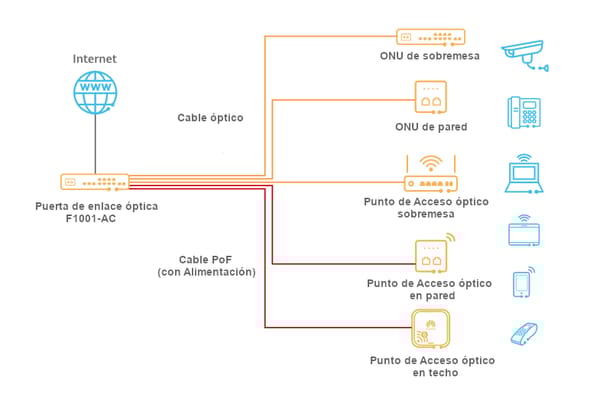 O adaptador de energia integrado de Fibra Óptica Avançada com Energía (AFwP) fornece energia ao ponto de acesso óptico de downlink através da porta PoF. O ponto de acesso óptico remoto não precisa ser alimentado localmente. O F600C-30-1GH e o F600P-30-1GH suportam funcionalidade plug-and-play e configuração automática de rede.